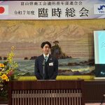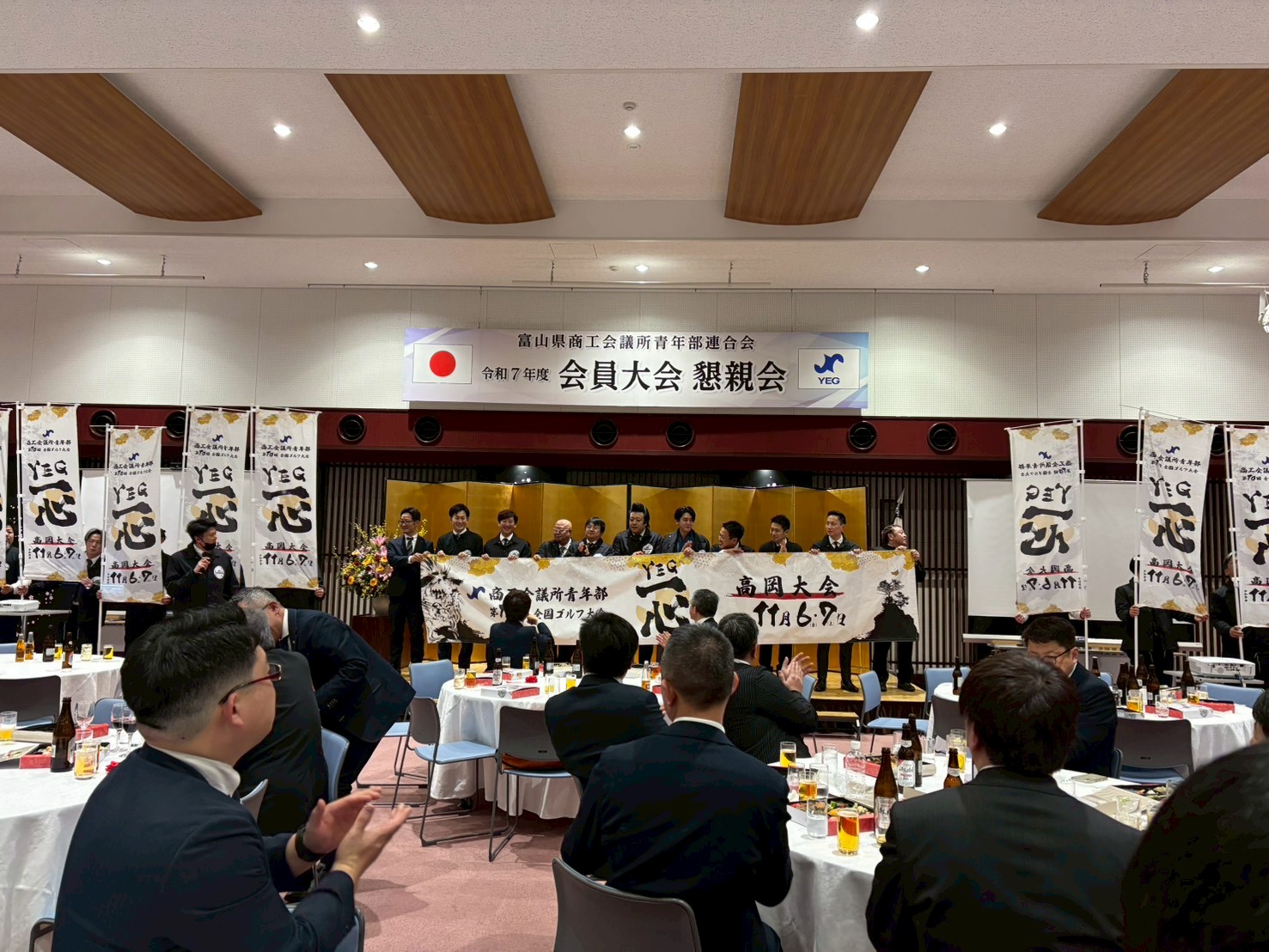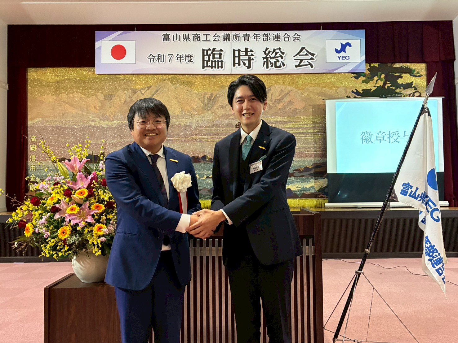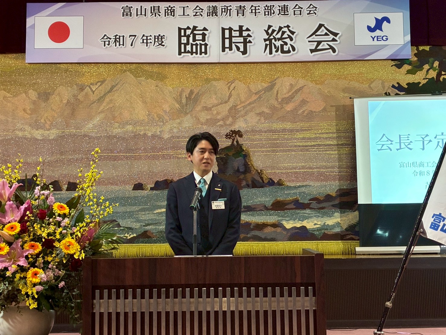 臨時総会では、令和 8 年度の活動に向け、富山県連の役員および北陸信越ブロック・日本YEG への出向役員の承認、さらに次年度会員大会の開催地について承認をいただきました。また、ご来賓として**出町譲高岡市⾧、能作克治高岡商工会議所会頭、菊池孝一**日本商工会議所青年部副会⾧より、温かいご祝辞を頂戴しました。会員大会では、足元の悪い中にもかかわらず多くのご来賓にご臨席いただき、対外交流を深めるとともに、県連 8 単会の結束をより一層強める貴重な機会となりました。